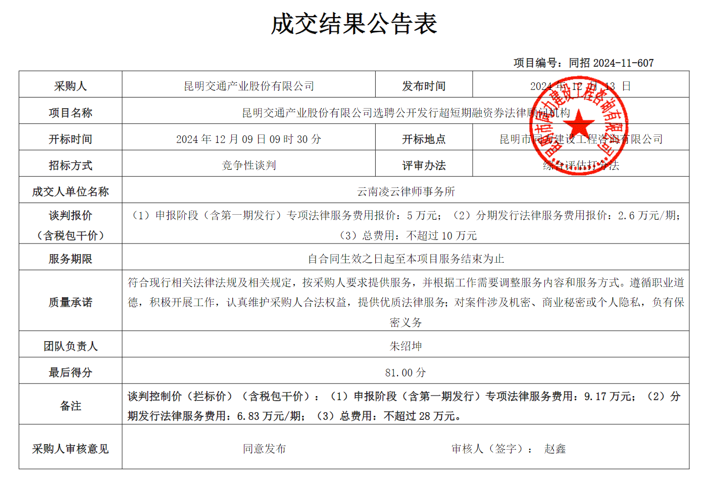 昆明交通产业股份有限公司选聘公开发行超短期融资券法律顾问机构成交结果公告