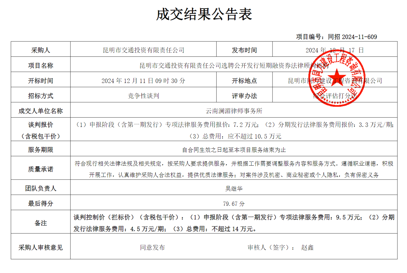 昆明市交通投资有限责任公司选聘公开发行短期融资券法律顾问机构成交结果 公告