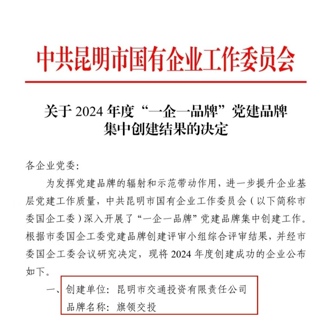 近日,中共昆明市国有企业工作委员会通报了《关于2024年度“一企一品牌”党建品牌集中创建结果的决定》,公司党委报送的“旗领交投”党建品牌经评审