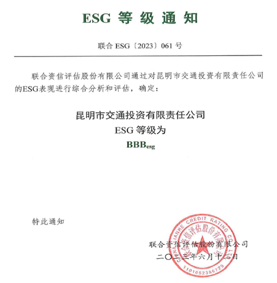 昆明市交通投资有限责任公司(以下简称“pa集团官网公司”)于2023年6月12日获得国内知名评级机构--联合资信评估股份有限公司评定的BBBesg评级。标志着pa集团官网公司成为首家获得专业评级机构ESG评级的昆明市属国企。 E...