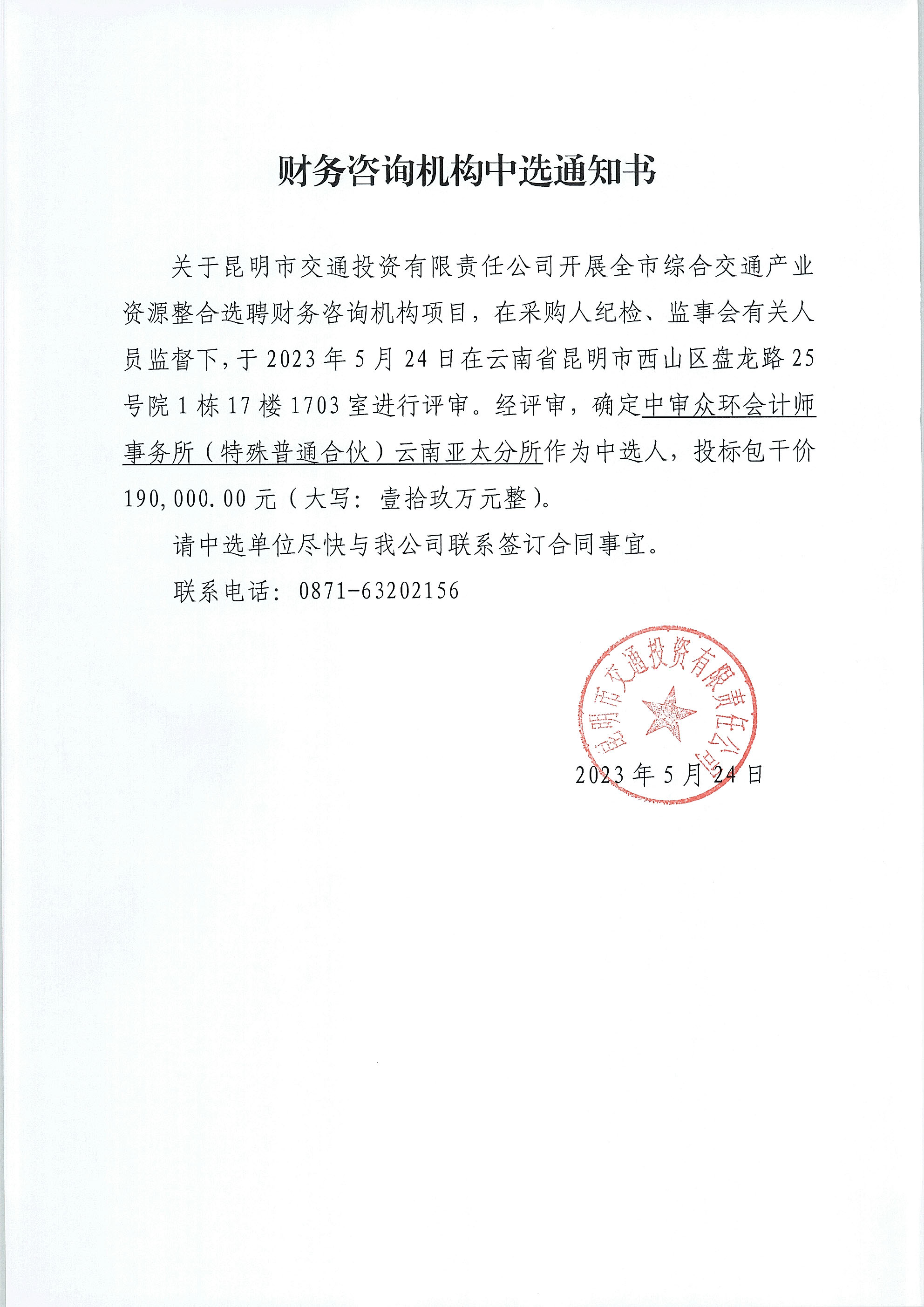 财务咨询机构中选通知书